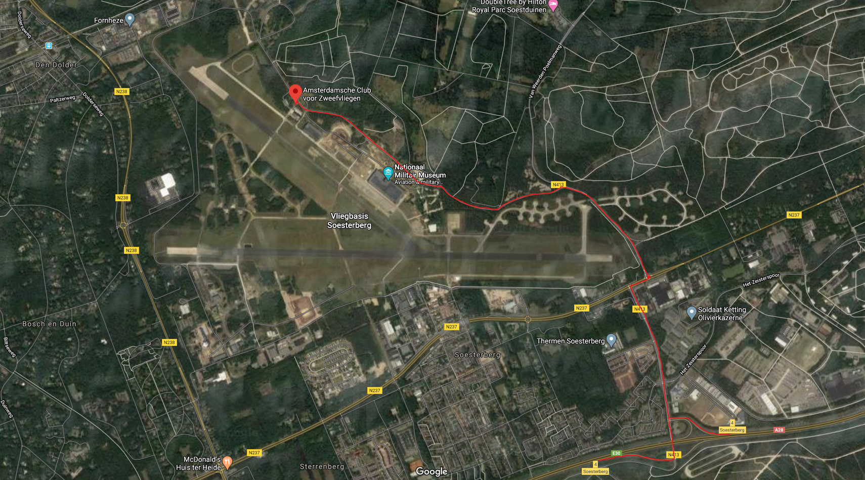 U loopt/fietst in het verlengde van de toegangspoort langs het museum op (het museum ligt dan aan uw linkerhand) tot u bij de slagboom komt. U gaat langs deze slagboom en blijft alsmaar rechtdoor lopen/fietsen tot de derde verharde weg aan de linkerkant. Daar vind u het toegangshek (met stoplicht) naar het zweefvliegveld, hier dient u een ACvZ-lid te bellen om het hek voor u open te doen.